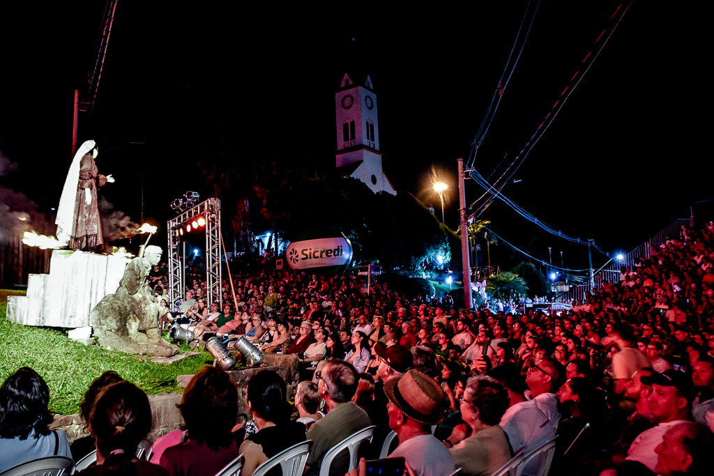 A programação se estendeu pela sexta-feira, sábado e domingo, com públicos expressivos em todas as noites. Na sexta-feira, cerca de 5 mil pessoas acompanharam a encenação. No sábado, o número saltou para aproximadamente 10 mil espectadores. E no domingo, a noite foi de cerca de 7 mil pessoas acomodadas nas arquibancadas e cadeiras dispostas ao redor do imponente Convento São Boaventura. Ao todo, mais de 50 excursões confirmadas trouxeram visitantes dos mais diversos cantos da região Sul do país.
